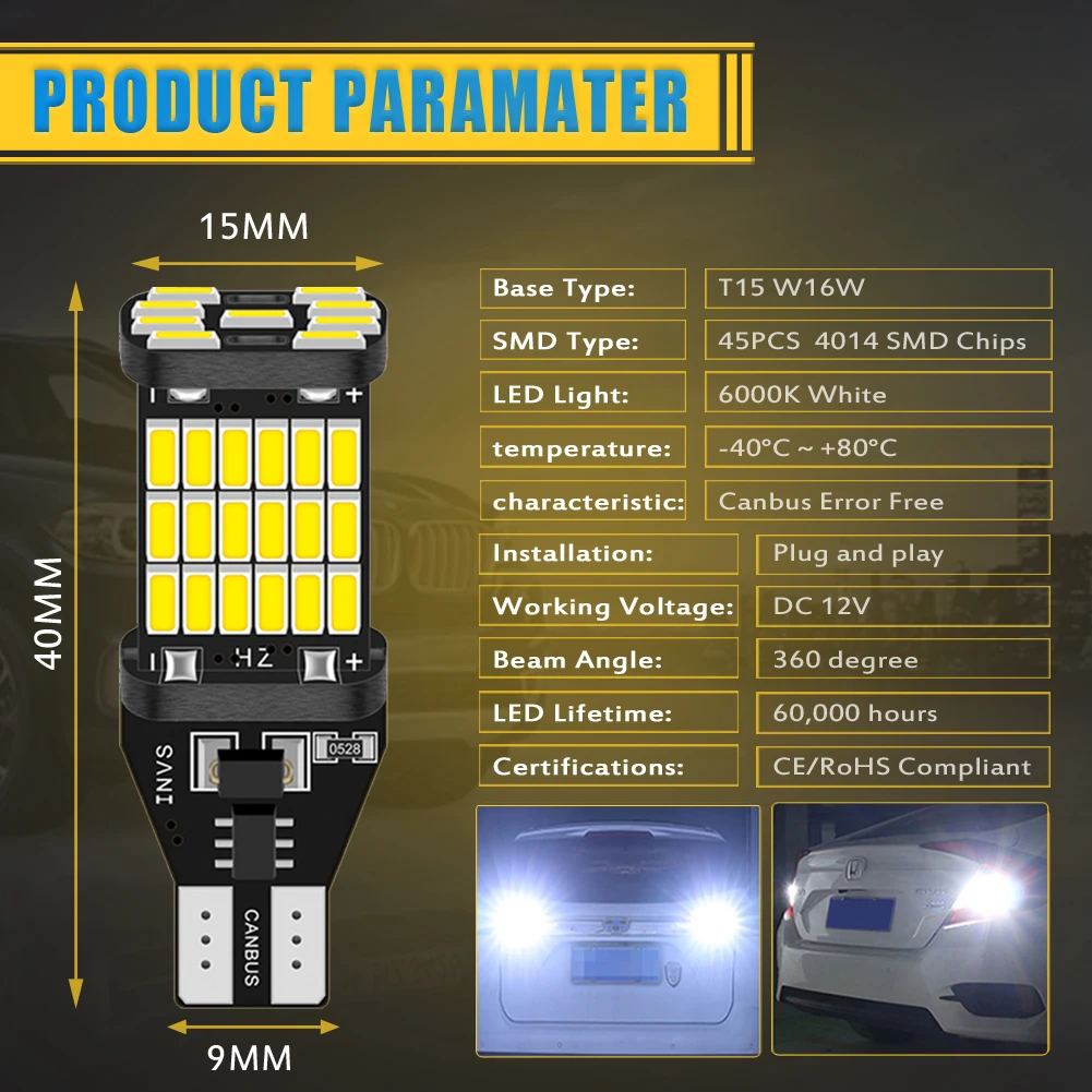 5. Перфектен заместител на стара халогенна лампа. T15 W16W 912 921 всички модели автомобил Универсална употреба